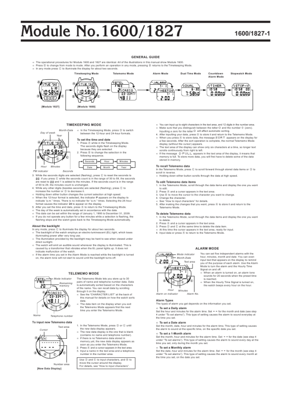 � You can input up to eight characters in the text area. � Anytime while the cursor is on the display, you can press D and E at the same time to clear it. 6. After you finish inputting data, press A to return to the Alarm Mode. � If you input reminder text, the text appears on the display when the alarm time is reached. � Note that reminder text appears only if the watch is in the Timekeeping Mode when the alarm time is reached. Otherwise, only the alarm tone sounds (without the reminder text).