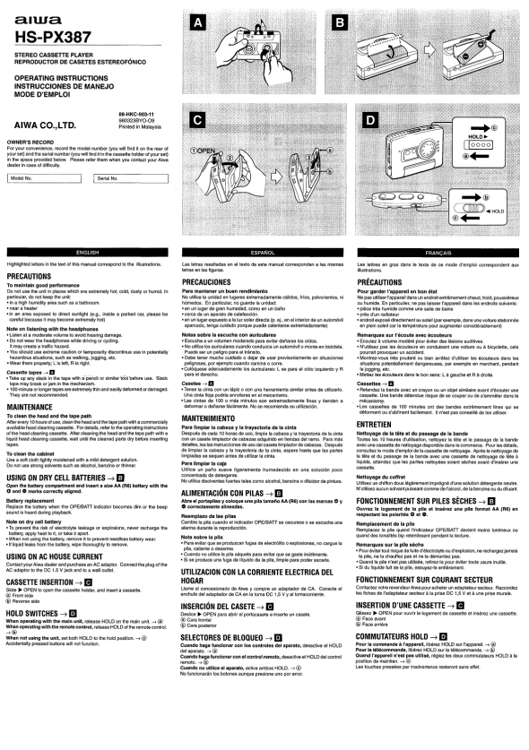 OWNER�SRECORD For your convenience, record the model number (you will find it on the rear of your set) and the serial number (you will find it in the cassette holder of your set) in the space provided below. Please refer them when you contact your Alwa dealer in case of difficulty, Model No. Serial No.