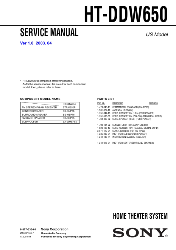Part No. 1-478-045-11 1-501-374-12 1-751-347-13 1-751-598-53 1-769-433-62 1-793-184-22 1-823-135-13 3-071-119-01 4-235-237-01 4-244-183-71 Description Remarks COMMANDER, STANDARD (RM-PP65) ANTENNA, LOOP(AM) CORD, CONNECTION (10m) (FOR SPEAKER) CORD, CONNECTION (PIN-PIN) (MONAURAL CORD) CORD, SPEAKER (3.5m) (FOR SPEAKER) CONNECTOR (F TYPE ADAPTOR)(FM) CORD (CONNECTION) (COAXIAL DIGITAL CORD) COVER, BATTERY (FOR RM-PP65) FOOT (FOR SUB WOOFER SPEAKER) INSTRUCTION MANUAL (ENGLISH)