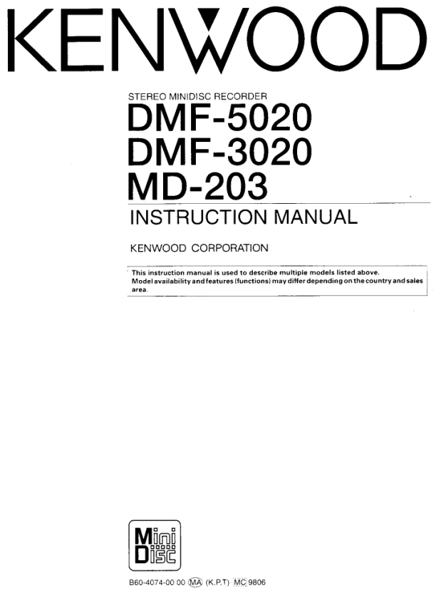 Description of KENWOOD MD203 Owner's Manual